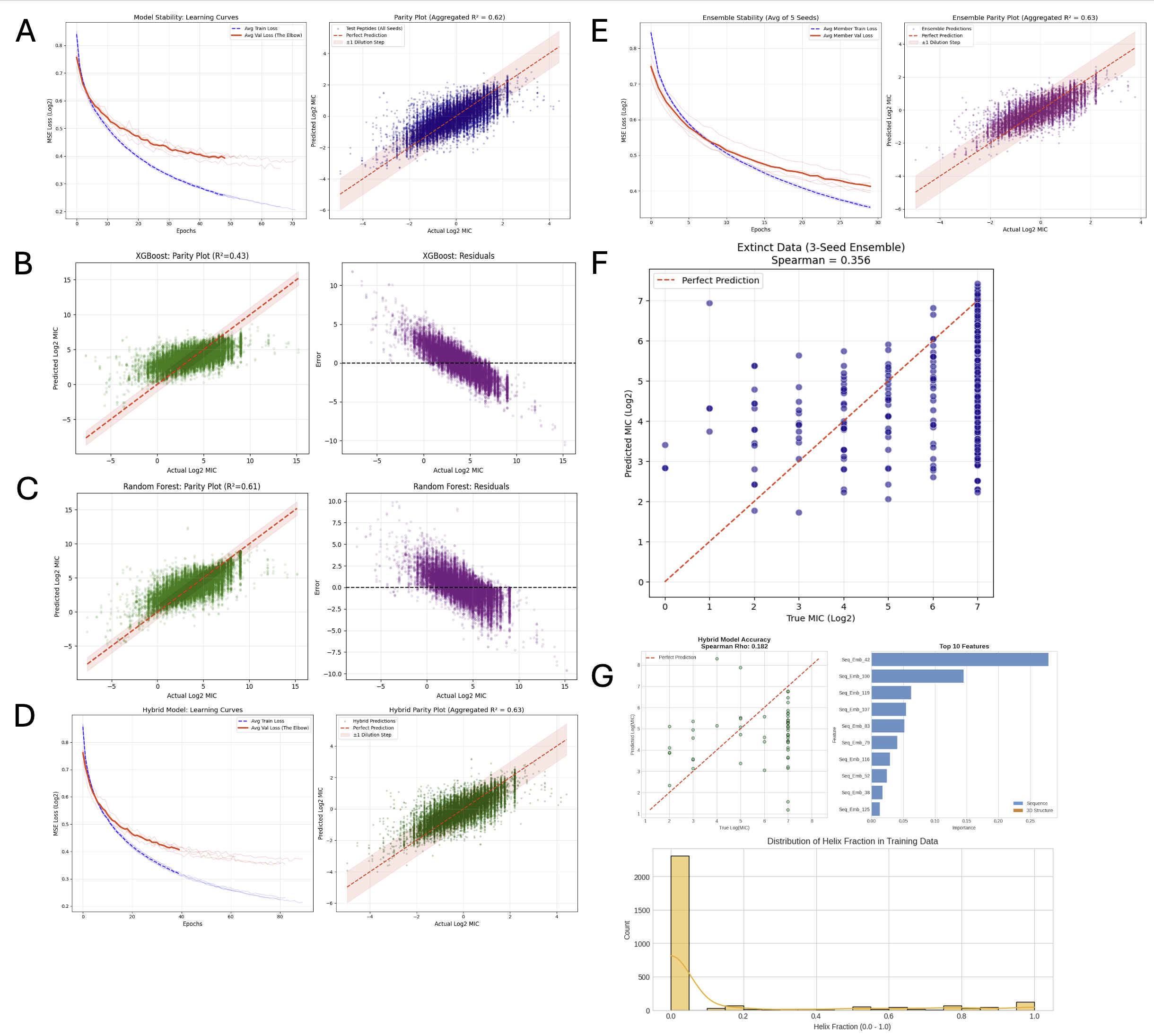 - Feature Rejection & Scientific Insight: Our multi-modal integration revealed that the model assigned < 1% feature weight to structural data, providing a crucial scientific insight: the low-value of static structural predictions (e.g., disordered state) for dynamic, membrane-targeting AMPs. The model’s rejection of structural features suggests that static 3D structures lack high predictive correlation with antimicrobial activity in this shifted domain.